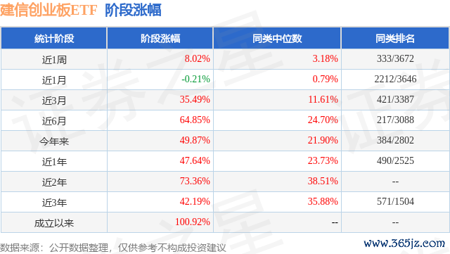 从业绩表现来看,建信创业板ETF基金过去一年净值涨幅为11.99%,在同类基金中排名1006/2216,同类基金过去一年净值涨幅中位数为11.09%。而基金过去一年的最大回撤为-29.04%,成立以来的最大回撤为-54.48%。