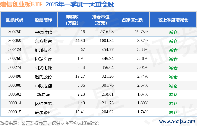 从基金规模来看,建信创业板ETF基金2025年一季度公布的基金规模为1.17亿元漢崋资本,较上一期规模1.29亿元变化了-1137.32万元,环比变化了-8.84%。该基金最新一期资产配置为:股票占净值比99.04%,无债券类资产,现金占净值比1.09%。从基金持仓来看,该基金当季前十大股票仓位达49.77%,第一大重仓股为宁德时代(300750),持仓占比为19.75%。
