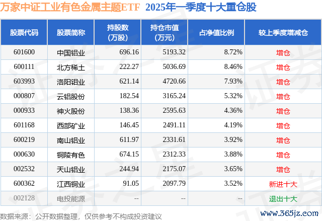 从基金规模来看,万家中证工业有色金属主题ETF基金2025年一季度公布的基金规模为5.95亿元,较上一期规模3.44亿元变化了2.51亿元,环比变化了73.09%。该基金最新一期资产配置为:股票占净值比99.36%,无债券类资产,现金占净值比0.93%。从基金持仓来看,该基金当季前十大股票仓位达53.95%,第一大重仓股为中国铝业(601600),持仓占比为8.72%。