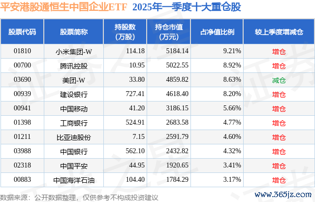 从基金规模来看中鼎策略,平安港股通恒生中国企业ETF基金2025年一季度公布的基金规模为5.63亿元,较上一期规模4.73亿元变化了9009.09万元,环比变化了19.05%。该基金最新一期资产配置为:股票占净值比95.73%,无债券类资产,现金占净值比4.53%。从基金持仓来看,该基金当季前十大股票仓位达60.89%,第一大重仓股为小米集团-W(01810),持仓占比为9.21%。