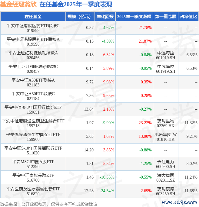 平安港股通恒生中国企业ETF现任基金经理为翁欣 李严。其中在任基金经理翁欣已从业1年又129天,2024年7月30日正式接手管理平安港股通恒生中国企业ETF,任职期间累计回报为29.98%。目前还管理着13只基金产品(包括A类和C类),其中本季度表现最佳的基金为平安中证港股通医药卫生综合ETF(159718),季度净值涨幅为23.22%。